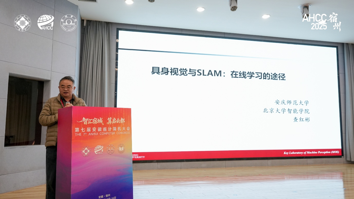 大会邀请我院查红彬教授作主旨报告。查红彬教授以《具身视觉与SLAM:在线学习的途径》为题,系统介绍在线学习在动态SLAM、自适应VIO、三维重建与隐式地图建模中的关键作用,展示团队在复杂环境智能感知能力提升方面的最新研究成果,为具身智能在真实场景落地提供了重要启发。