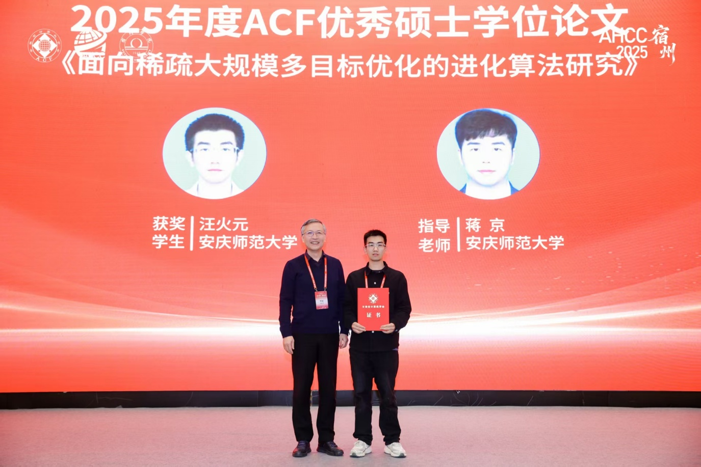 本届大会的优秀学位论文评选环节中,我院取得了喜人的成绩。蒋京副教授指导硕士生汪火元完成的《面向稀疏大规模多目标优化的进化算法研究》荣获“2025年度ACF优秀硕士学位论文”奖;汪文明副教授指导本科生刘燚完成的《基于STM32的心率体温监控系统的设计与实现》荣获“2025年度ACF优秀本科毕业设计(论文)”奖。上述荣誉充分体现了我校在教学质量提升和人才培养方面的良好成效,进一步激发了师生在科研创新与实践探索中的积极性与创造力。