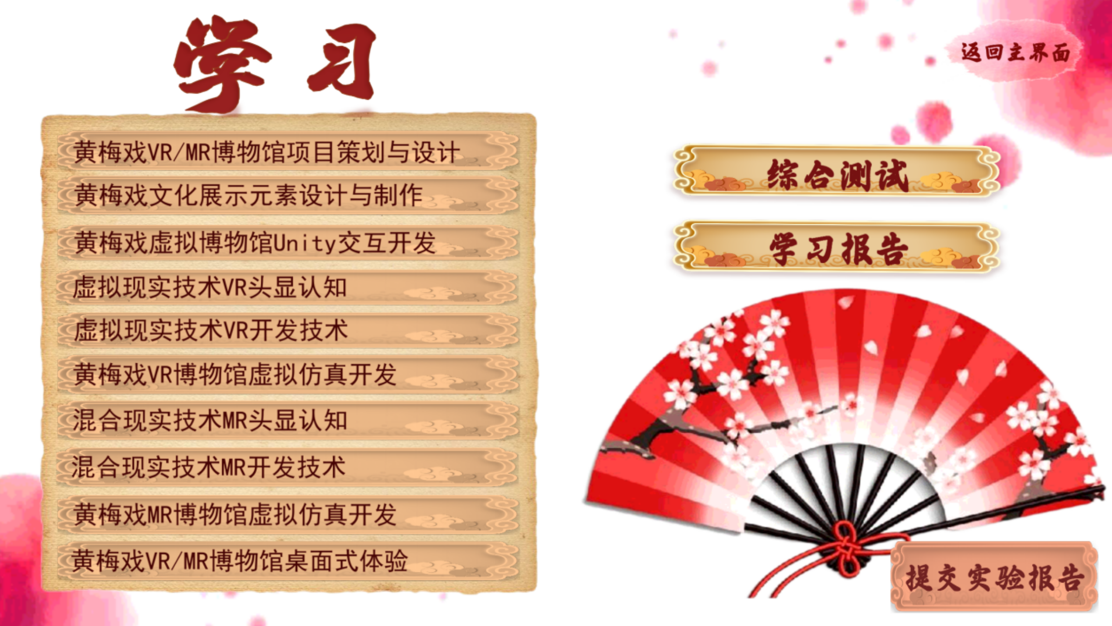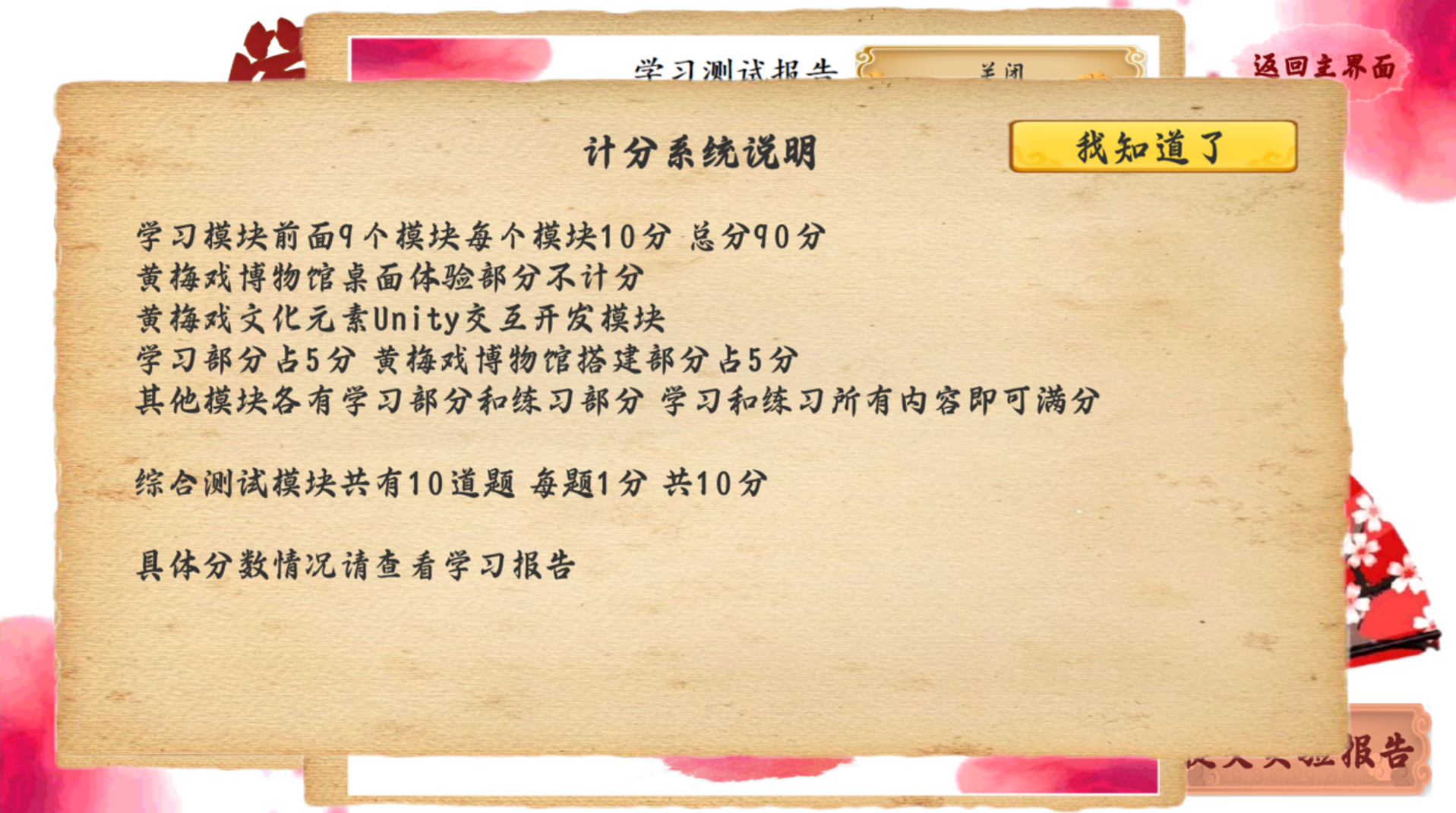 4. 学习步骤如下:屏幕左半边共10个章节,1-9章节总分10分,"黄梅戏博物馆桌面式体验"模块不计分 前九个章节总计90分。每个章节分为两部分,“学习模块”(共计5分)和“答题模块”或“实操模块”(共计5分)