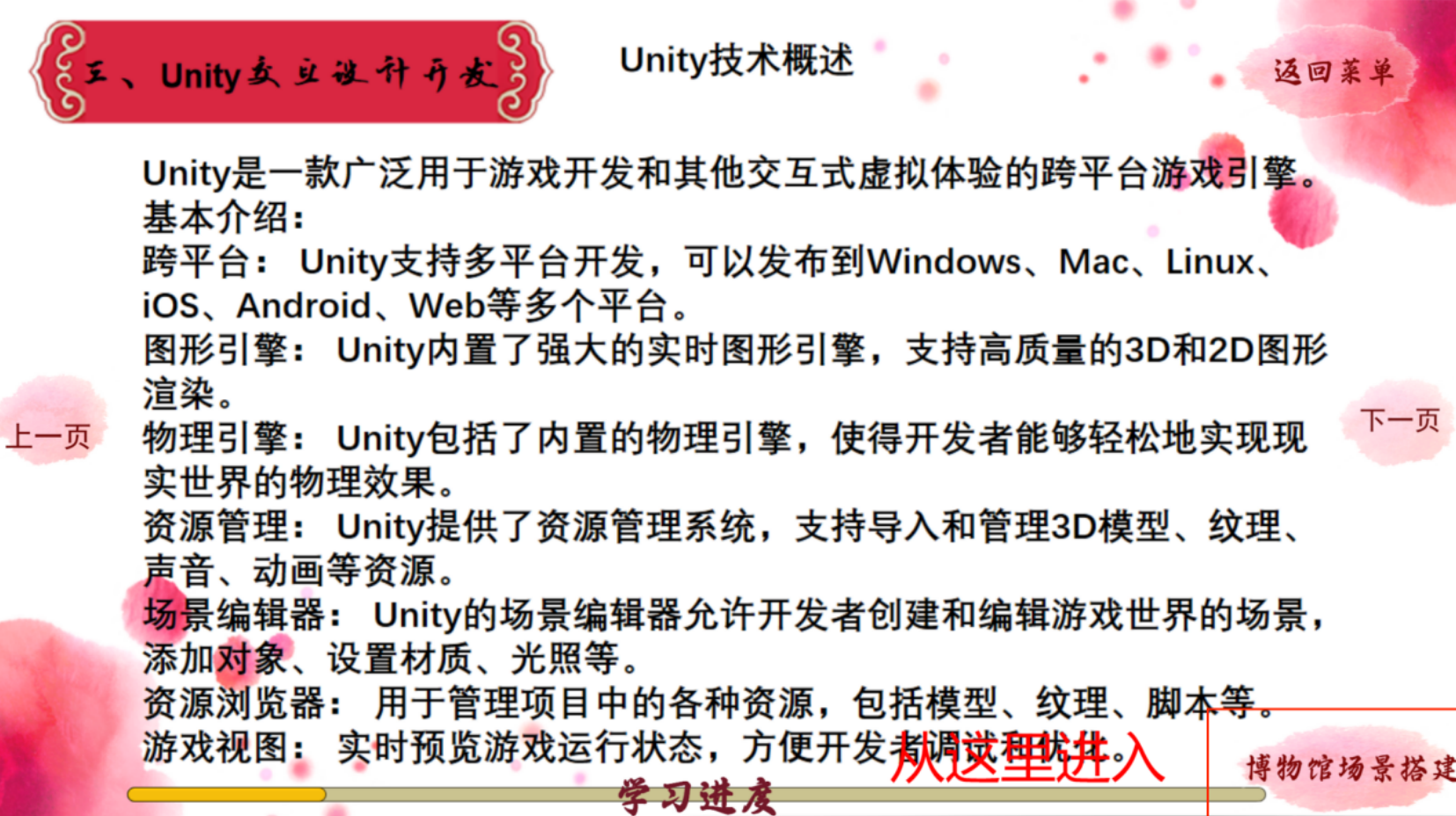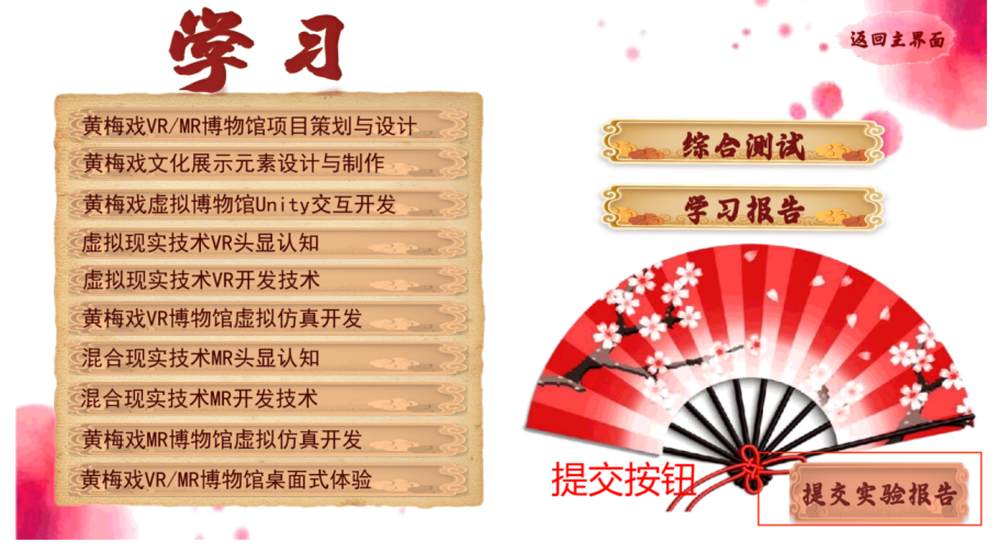 黄梅戏博物馆DIY实操模块:位于第三章Unity开发的学习模块内,本模块共计5分。点击右下角的"黄梅戏博物馆搭建"按钮即可进入体验,在该模块内你可以自由挑选由开发人员提供的精美建筑和装饰,搭建黄梅戏主题景观。