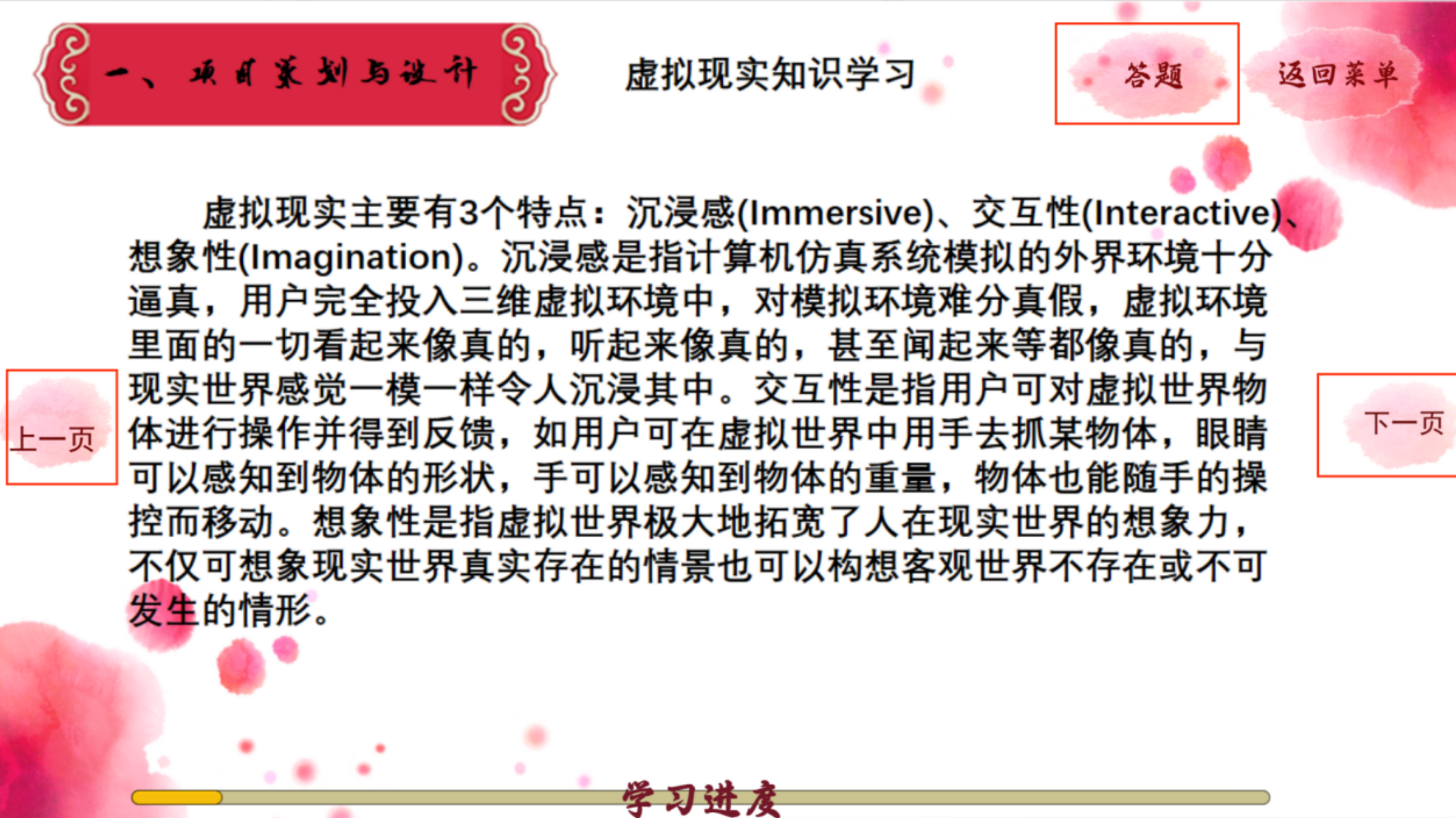学习模块使用方法:点击左侧和右侧的”上一页“和”下一页“按钮即可翻页(未看过的页面不允许快速翻页),点击页面内的”答题“按钮即可进入答题模块,点击”返回“按钮可以返回上一页