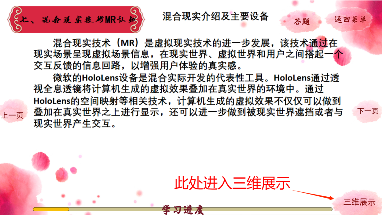 黄梅戏博物馆MR展示模块:本模块供学习 不计分。你可以在本模块了解当前的前沿VR/MR产品 并亲自通过可交互三维动画详细的了解它们的结构。