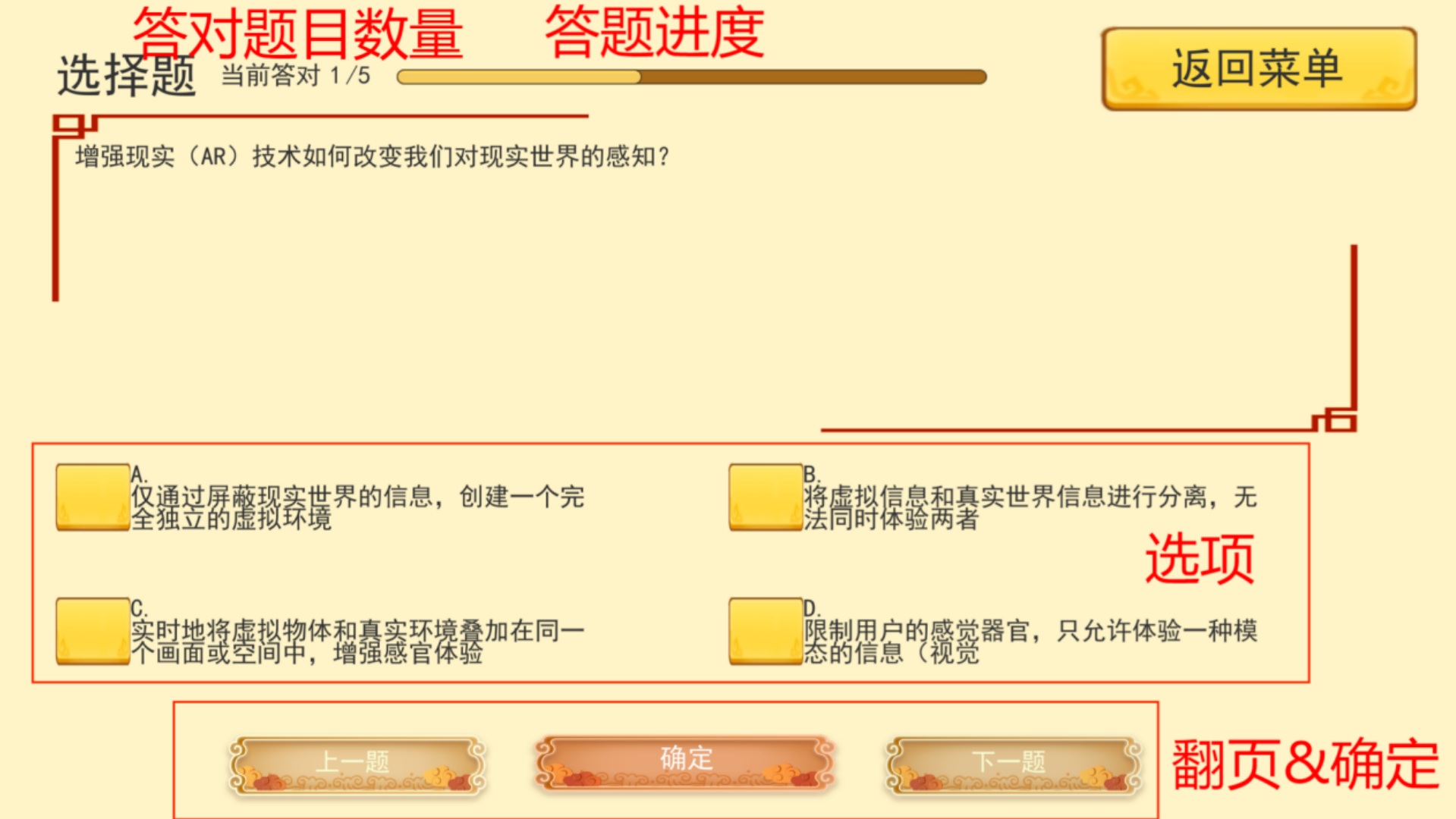 答题模块使用方法:点击”上一题“下一题”按钮可以切换题目 选中选项后点击”确认“按钮即可记录本题答案并显示正确答案